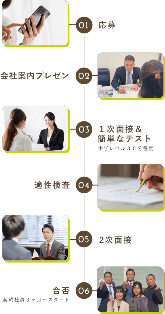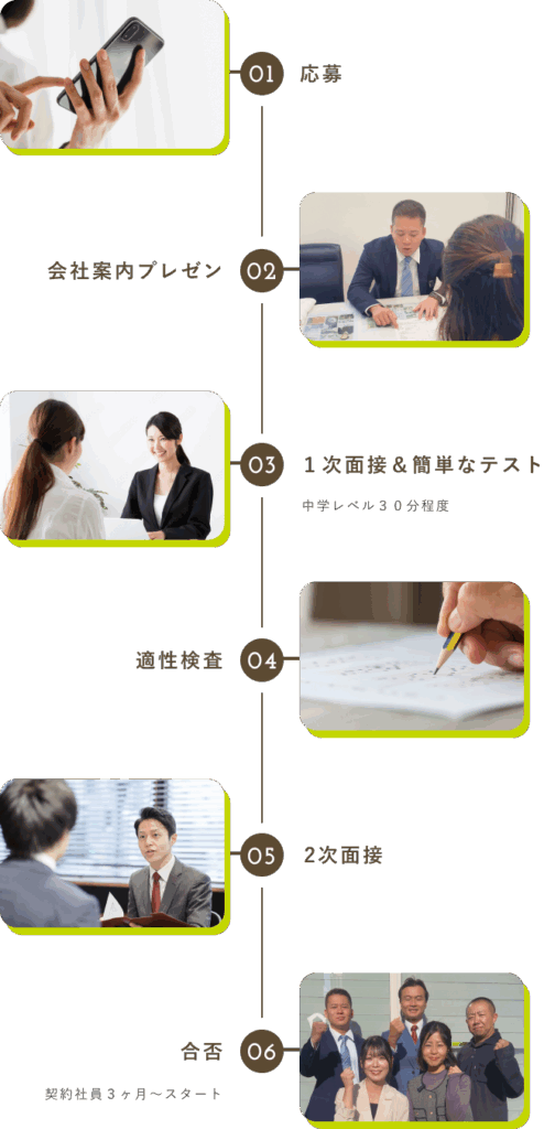 | 試用期間 | 試用期間あり(3ヶ月)契約期間3ヶ月 試用は本採用の95% |